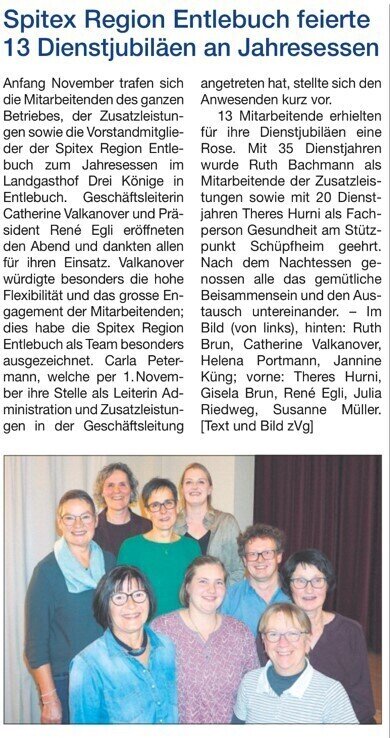 Anfangs November trafen sich die Mitarbeitenden des ganzen Betriebes, der Zusatzleistungen sowie die Vorstandmitglieder zum gemeinsamen Jahresessen im Landgasthof Drei Könige in Entlebuch. Die Geschäftsleiterin Catherine Valkanover und der im Mai neu gewählte Präsident René Egli eröffneten den Abend mit herzlichen Worten und dankten allen für den grossen Einsatz im laufenden Jahr. Die Geschäftsleiterin Catherine Valkanover würdigte besonders die hohe Flexibilität und das grosse Engagement der Mitarbeitenden; dies habe die Spitex Region Entlebuch als Team besonders ausgezeichnet. Das neue Geschäftsleitungsmitglied, Carla Petermann, welche per 1. November ihre Stelle als Leiterin Administration und Zusatzleistungen angetreten hat, stellte sich den Anwesenden kurz vor.